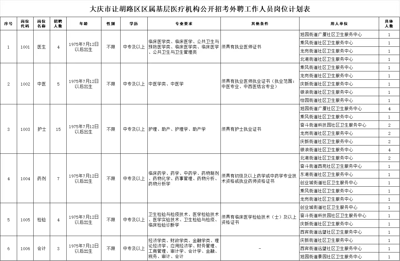 (四)具有符合招聘崗位要求的學(xué)歷、專(zhuān)業(yè)、年齡等條件,詳見(jiàn)《大慶市讓胡路區(qū)區(qū)屬基層醫(yī)療機(jī)構(gòu)公開(kāi)招考外聘工作人員崗位計(jì)劃表》(附件1);